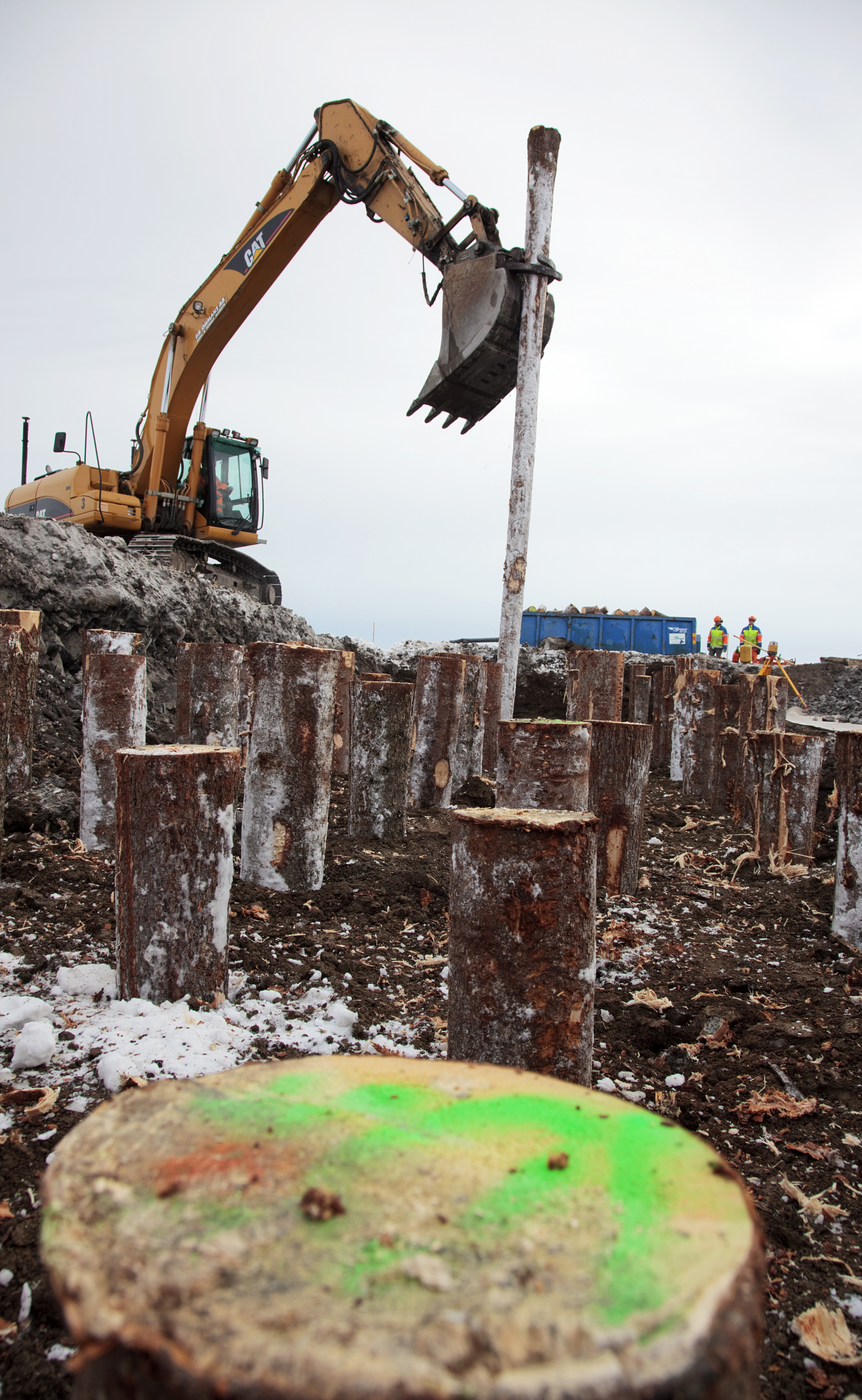 - Beskrivning: Pålning, 7 500 pålar av gran bankas ner i backen för att göra nya norra länken i Umeå körbar.