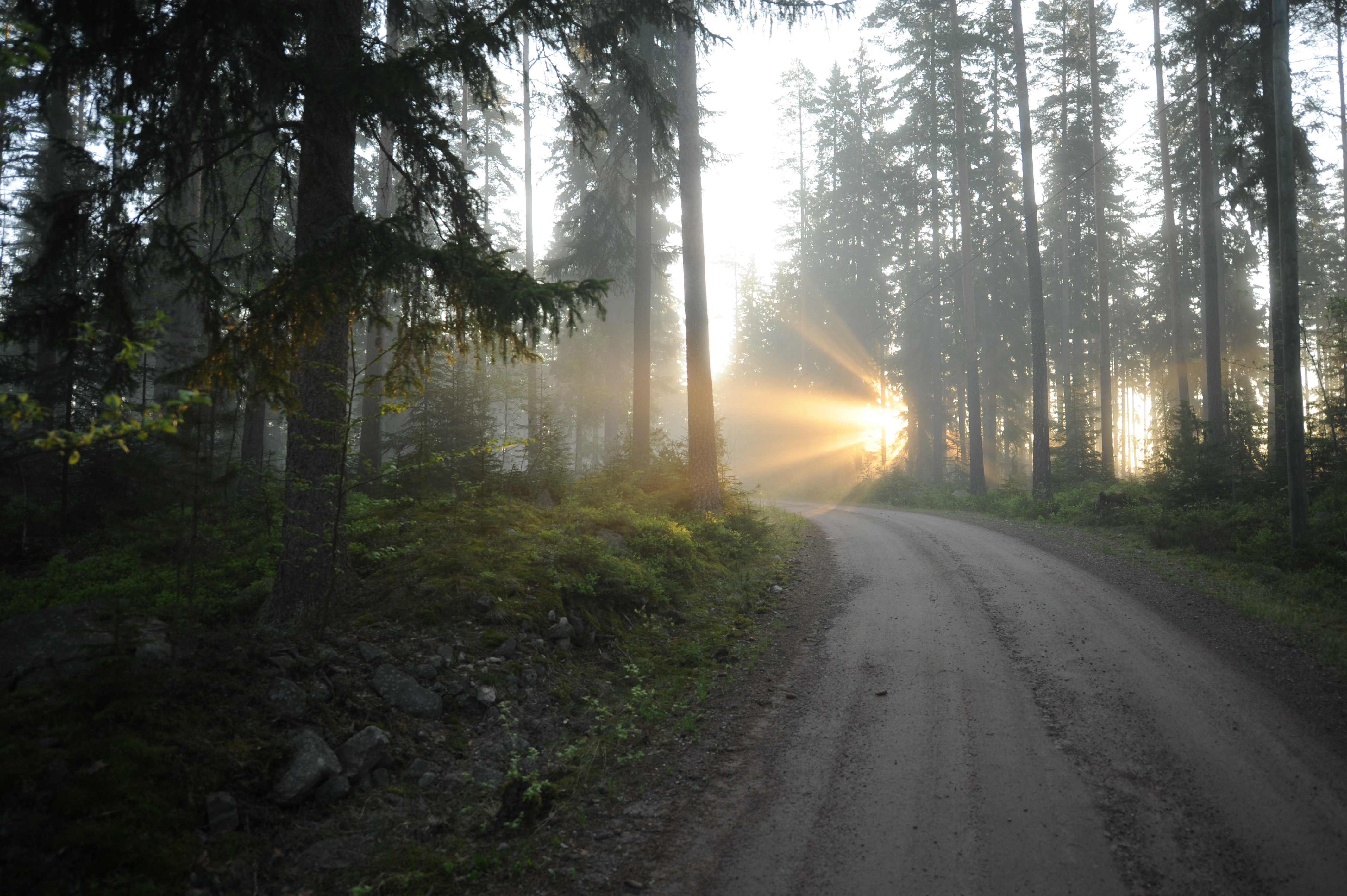 Skogsväg i soluppgång