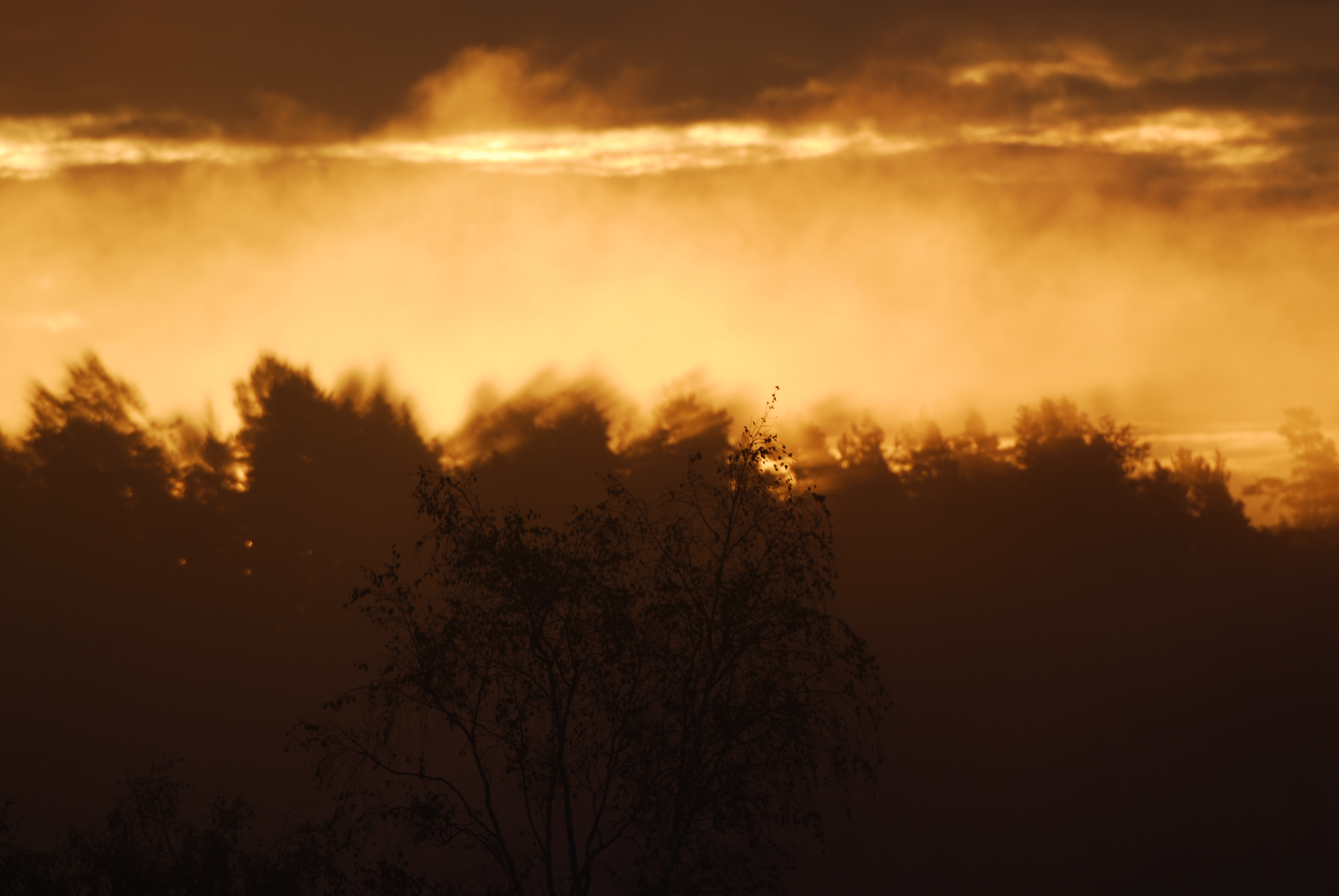 - Beskrivning: Skogslandskap i dimma och soluppgång / solnedgång, gryning