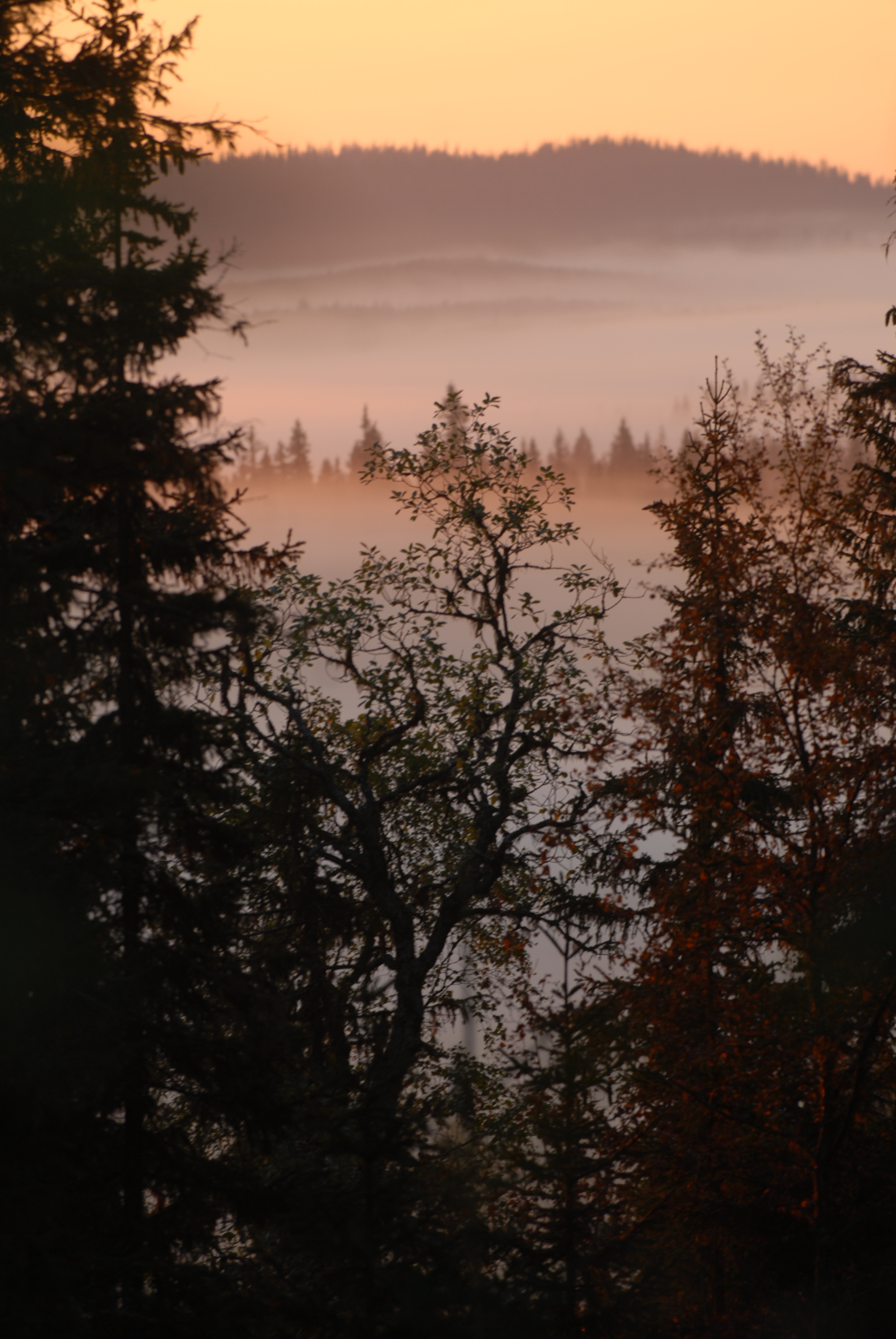 - Beskrivning: Skogslandskap i dimma, soluppgång, gryning