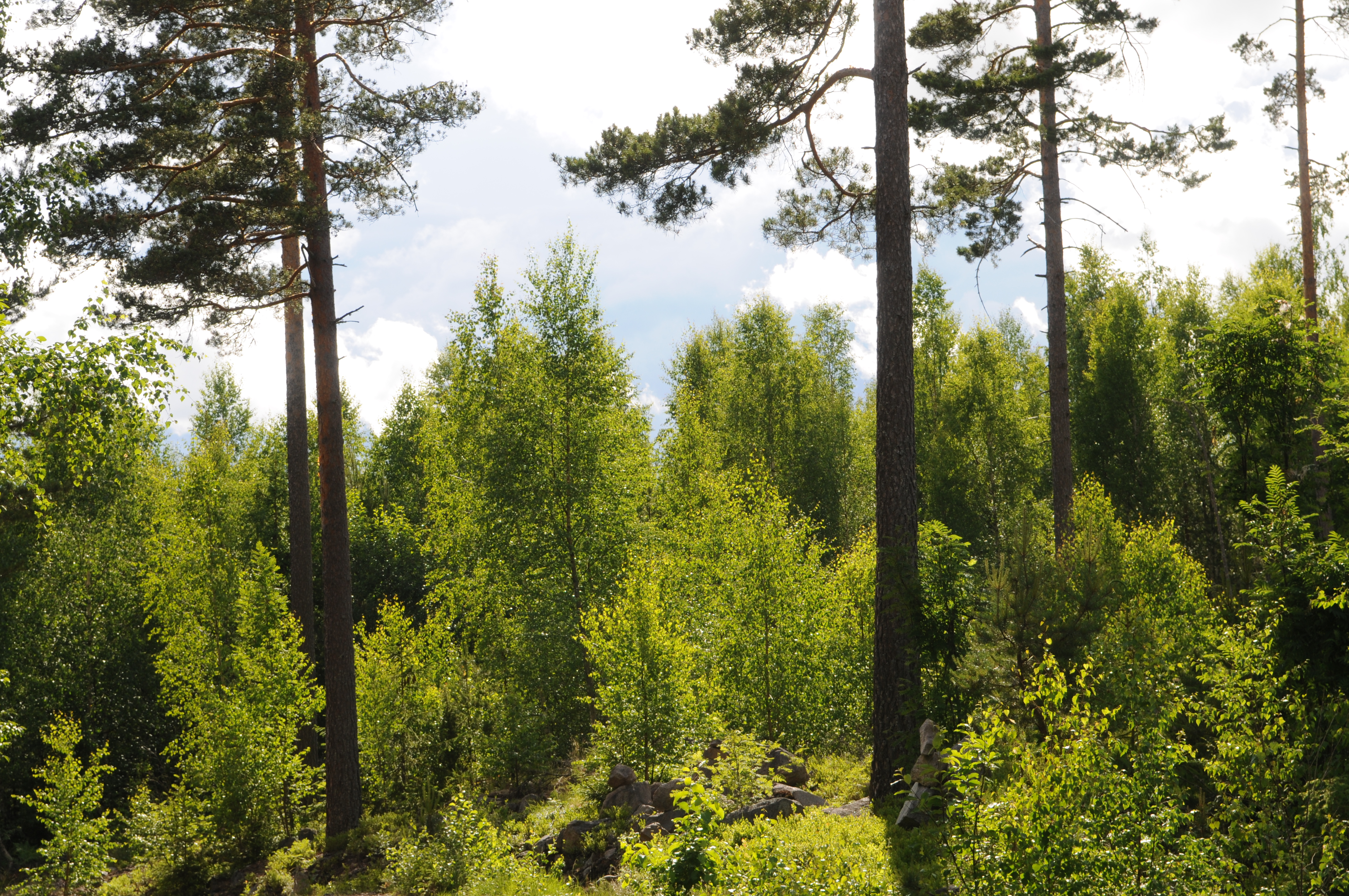 - Beskrivning: Tallar och lövträd i sommargrönska