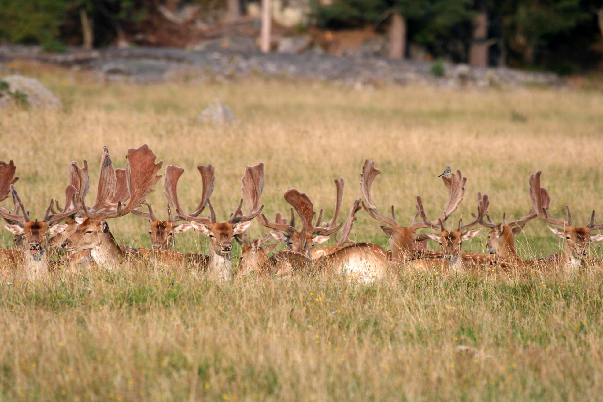 - Beskrivning: Vilande dovskovlar. Sädesärla sitter i en krona.