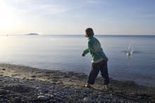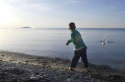 Beskrivning: Pojke som kastar sten i vattnet. Ekopark Böda.